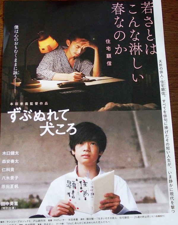 京都みなみ会館で「ずぶぬれて犬ころ」という映画を見た。自由律俳句の世界に彗星のごとく現れ、25歳で早世した住宅謙信(すみたくけんしん)の生きざまを描いた作品である。五七五の定型や季語にとらわれず簡潔な言葉に思いをつぎ込む。レストランなどで働き、僧侶となったが急性骨髄性白血病を発症した主人公。~つづく