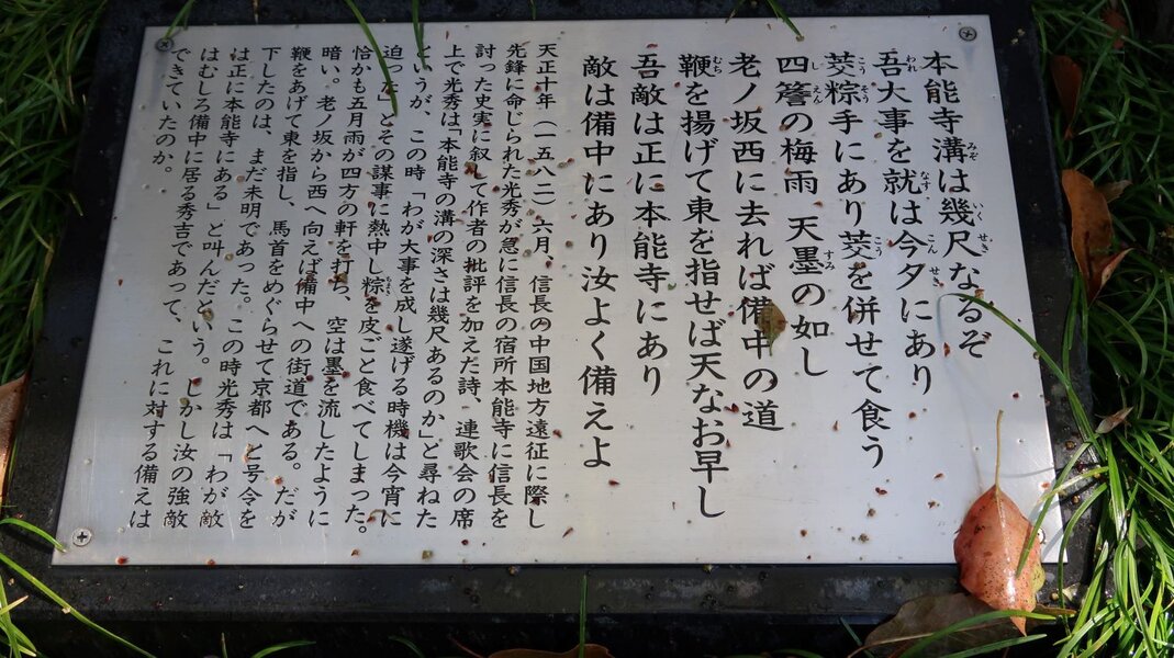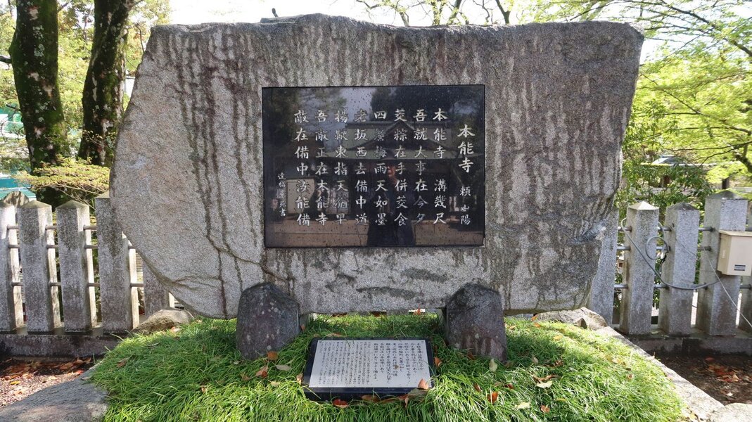 明智光秀を祀る京都府福知山市の御霊神社の境内には、「本能寺」の詩碑がある。逆臣として名が残った光秀だが善政を敷いたことで福知山の領民に慕われている。詩は江戸時代の漢詩人、頼山陽が「敵在備中汝(なんじ)能(よく)備」=「本当の敵(秀吉)は備中にあり、なんじよく備えよ」の意の碑文など境内の見所は多い。