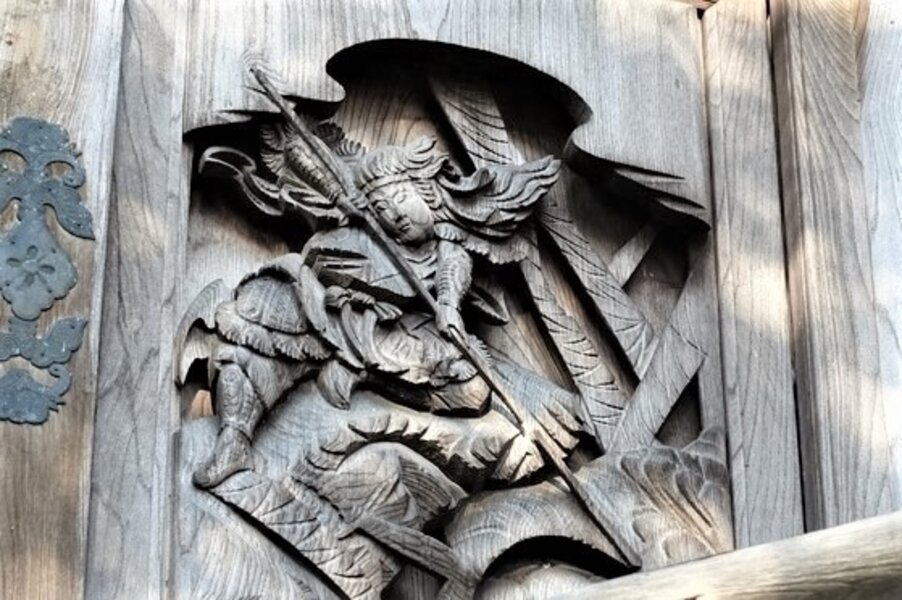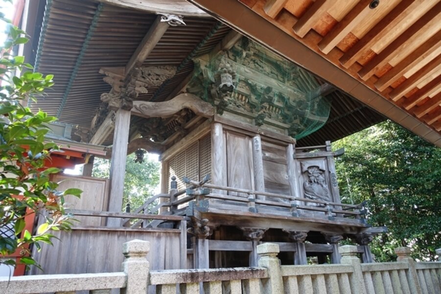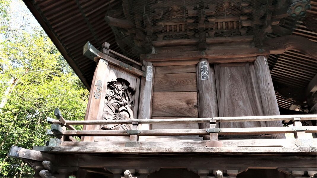 本殿の彫刻が印象的である。片方に土蜘蛛、もう一方には鷹が描かれ、これを抑える応神天皇の図がある。天(鷹)も地(蜘蛛)も平定し世の中が良くなるとの願いが込められているようだ。