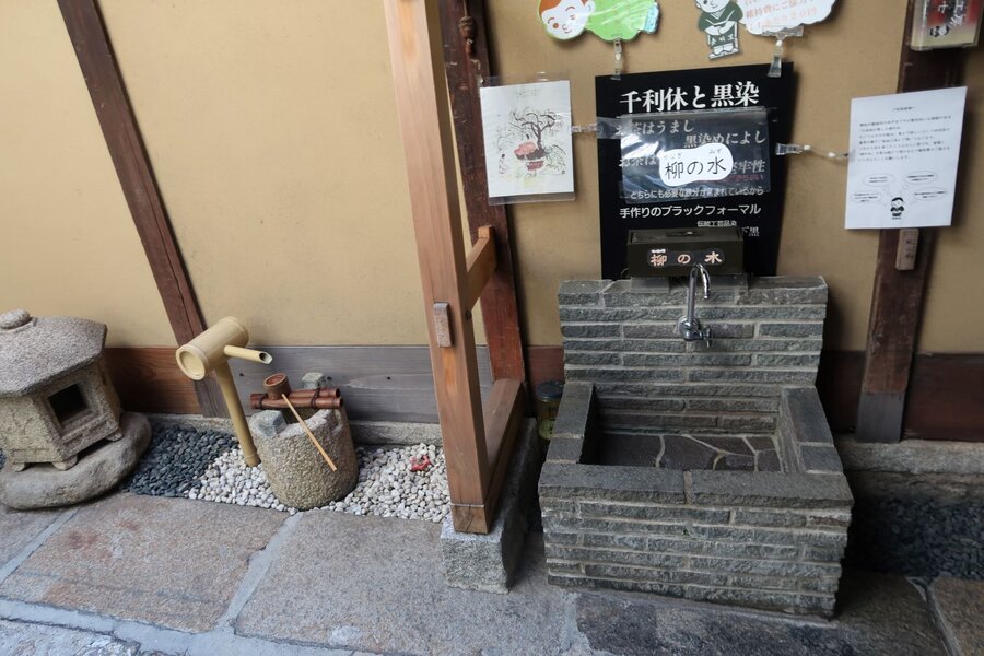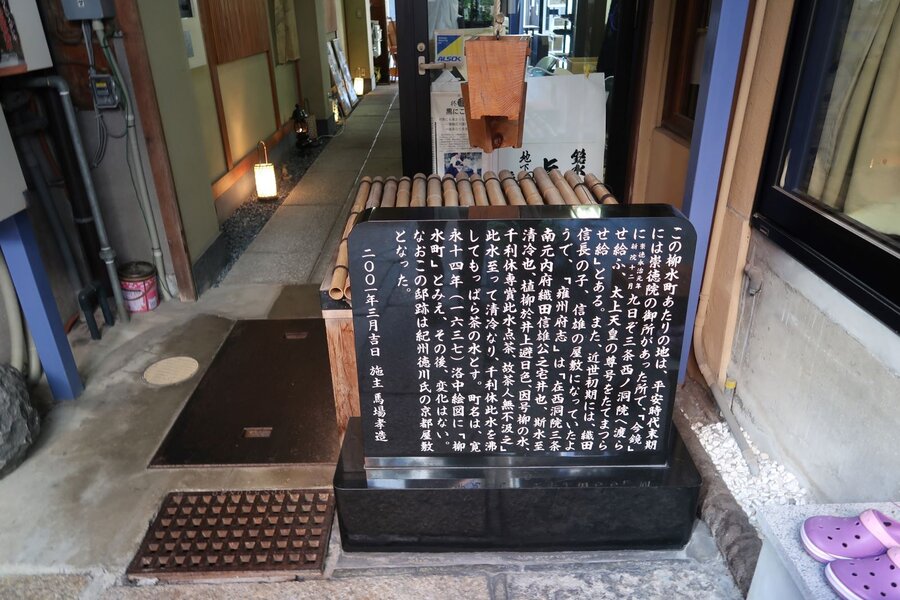「柳の水」は、西洞院通三条通下ルにある名水で、地下25mからポンプでくみ上げられ、現在も市民が利用している。このあたりは織田信長の二男・信雄の屋敷跡で、江戸時代以後は紀伊徳川家の京屋敷となり、現在は馬場染工場が建っている。また崇徳上皇の御所があった場所、千利休も茶の湯に使うなど著名人ゆかりが多い。