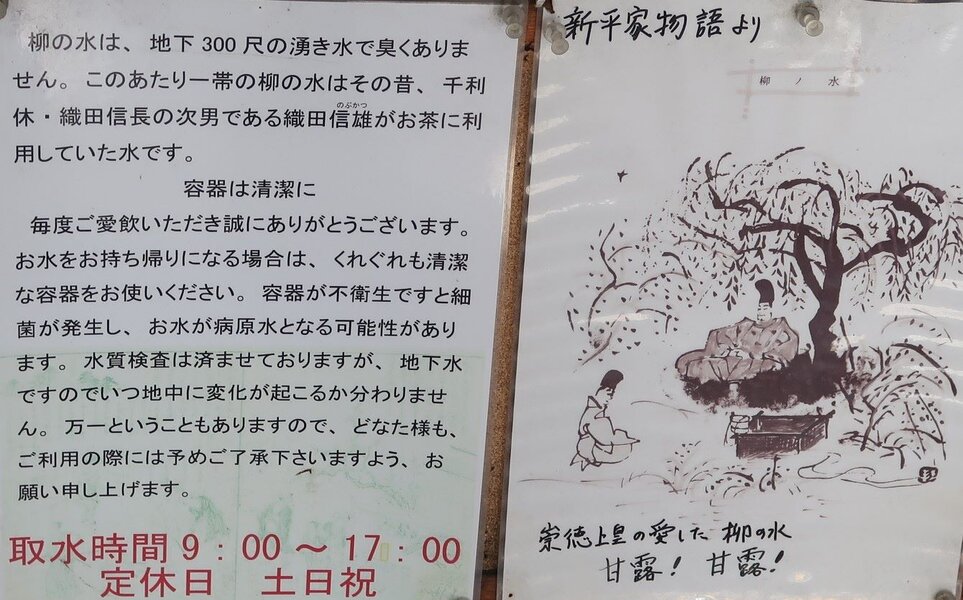 斯水至清冷也、植柳於井上避日色、因号柳の水、千利休専賞此水点茶、故茶人無不汲之」