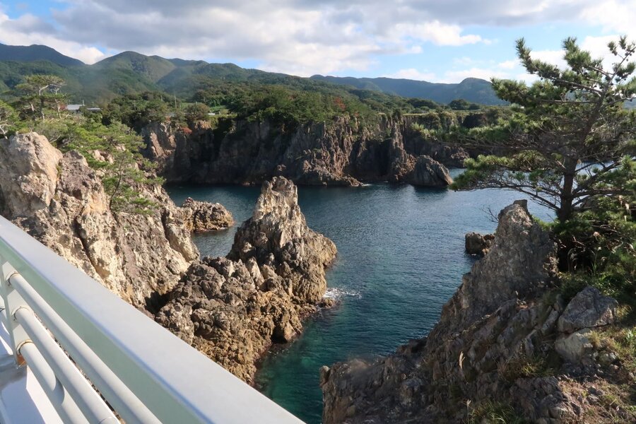 グラスボートに乗船して雄大で詩情豊かな景観を海中の景色と魚群とともに楽しめる。2枚目の写真で、手前にちらりと見える橋は映画「君の名は」のロケ地。なお船上からの景観の一端は動画をご参照のほどを・・。