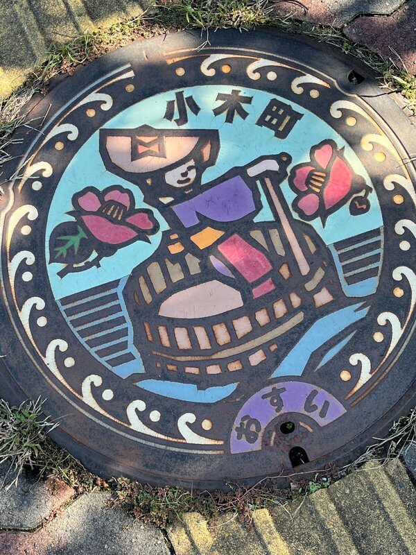 佐渡の南の玄関口、小木町のマンホール。デザインは、たらい舟をこぐ女性(着物にすげ笠)と、町の花の「ツバキ」、周囲には波らしい模様がある。ローカル色に富んで楽しい。