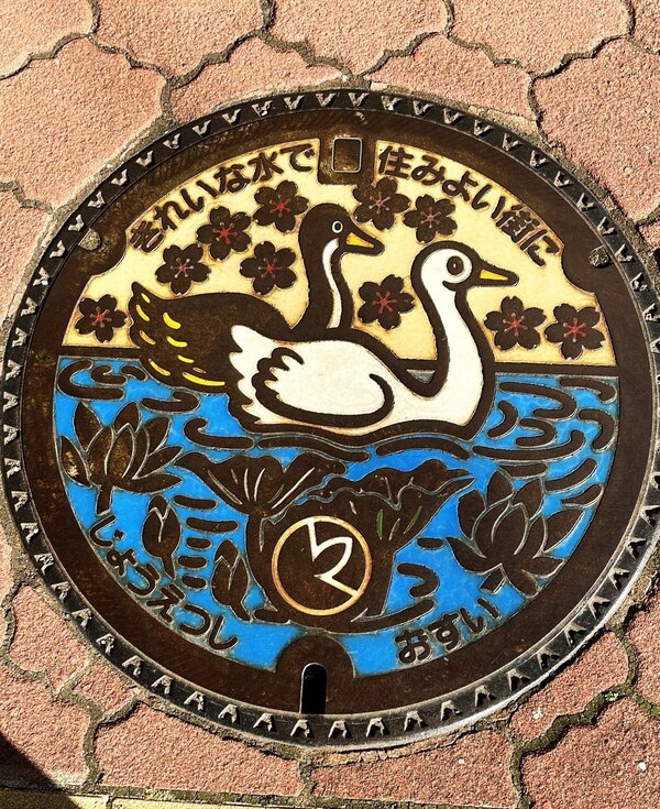路上の芸術ともいえるマンホールの蓋。絵柄は高田城址公園の「黒鳥と白鳥」のほか、ハスとサクラの花が描かれている。下部は「上」を草書体であらわした上越市の市章。昼食に立ち寄った本町通りのアーケード下で発見したもの。