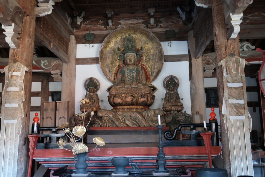 木造釈迦三尊坐像(重要文化財)、本尊・釈迦如来坐像は円派仏師・豪円作と伝えられている。右は文殊菩薩、左は普賢菩薩。