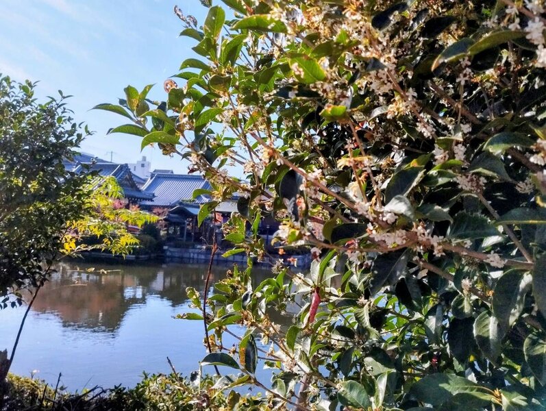 神泉苑の池の端とギンモクセイ