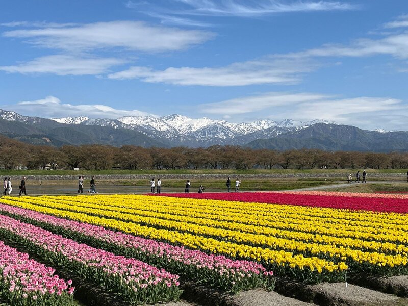 北アルプスの残雪の朝日岳を背景に、桜並木とチューリップ、菜の花が奏でる、あさひ舟川「春の四重奏」。 惜しむらくは桜は終わって「春の三重奏」でした。